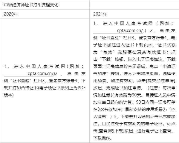 2021初中级经济师电子证书样本曝光,有这些变动!发表时间:2022-02-16 09:57 最新消息,除湖南地区外,全国大部分地区考生已可以查询2021初、中级经济师电子证书。纸质证书已在印制中,相信也不久后就会跟大家见面啦。 值得注意的是,2021年中级经济师电子证书领取方式以及规定发生变化,主要体现在“电子证书加注有限期”、“推行电子证书”、“证书打印流程”,由于中级经济师证书打印已经开启,为了方便考生们尽快了解新规则,中工建安网校小编为大家整理了以下内容,一起来看吧~ 一、2021年中级经济师电子证书样本图片 ![]() 该证书和去年经济师证书对比,样式发生了一些小变化,今年新增了“申请证书加注”的选择,证书上增加了“调用有效期”、“制发日期”,且盖章也变成了“中华人民共和国人力资源和社会保障部专业技术资格职业资格证书专用章”。 此外,证书批准日期为2021年经济师考试当天,也就是2021年10月31日。这意味着,中级经济师资格的获得日期是从2021年10月31日开始的。 二、2020年与2021年中级经济师证书打印流程对比 ![]() 三、中级经济师证书打印需加注有限期 注意:自持证人员申请加注当日起向前计算,90日内同一证书可存在3次有效加注,每次申请加注最长有效期限为90天;如无特别需要,建议按上限申请;目前支持的使用场景为“本人调用”。请根据本人使用需求,合理申请加注。 上一篇消防安全工程师的报考时间